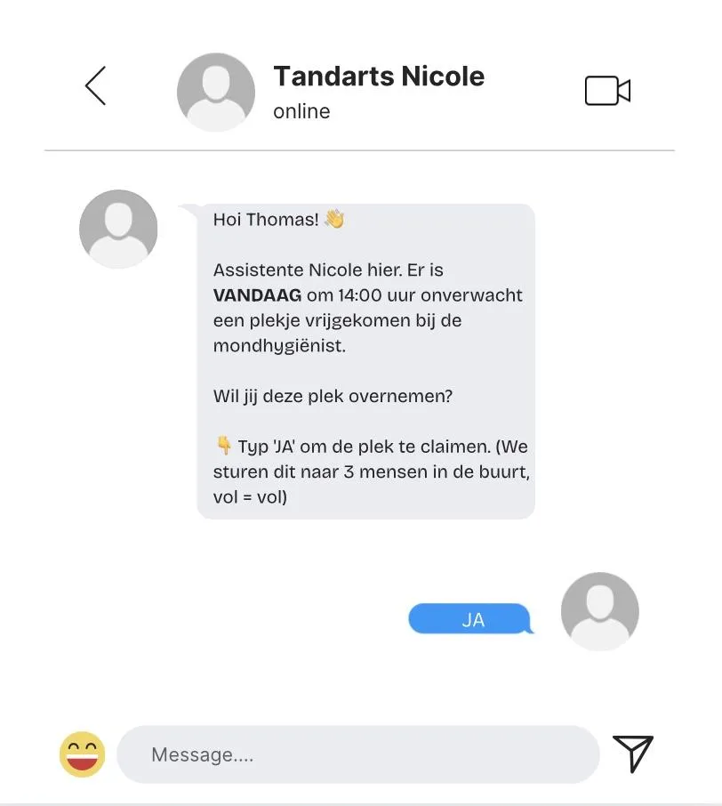 Het gaat niet om "of" je het gat vult, maar "hoe snel". Onze SMS-technologie bereikt je patiënten direct in hun broekzak. De eerste die reageert, heeft de plek.